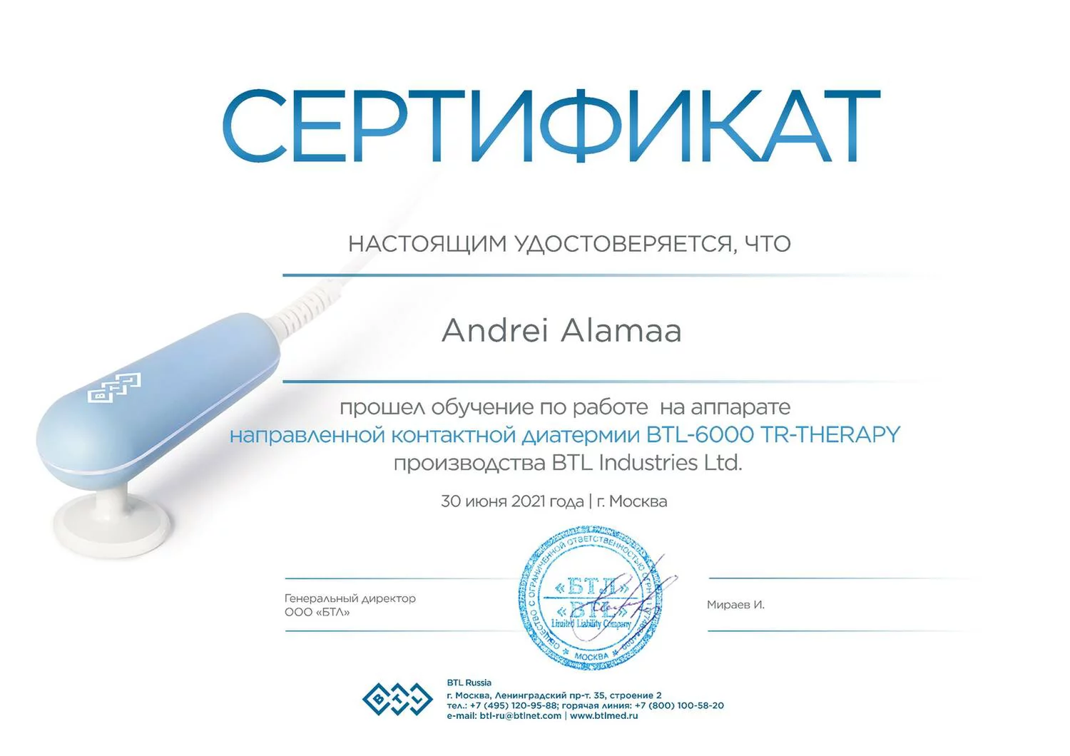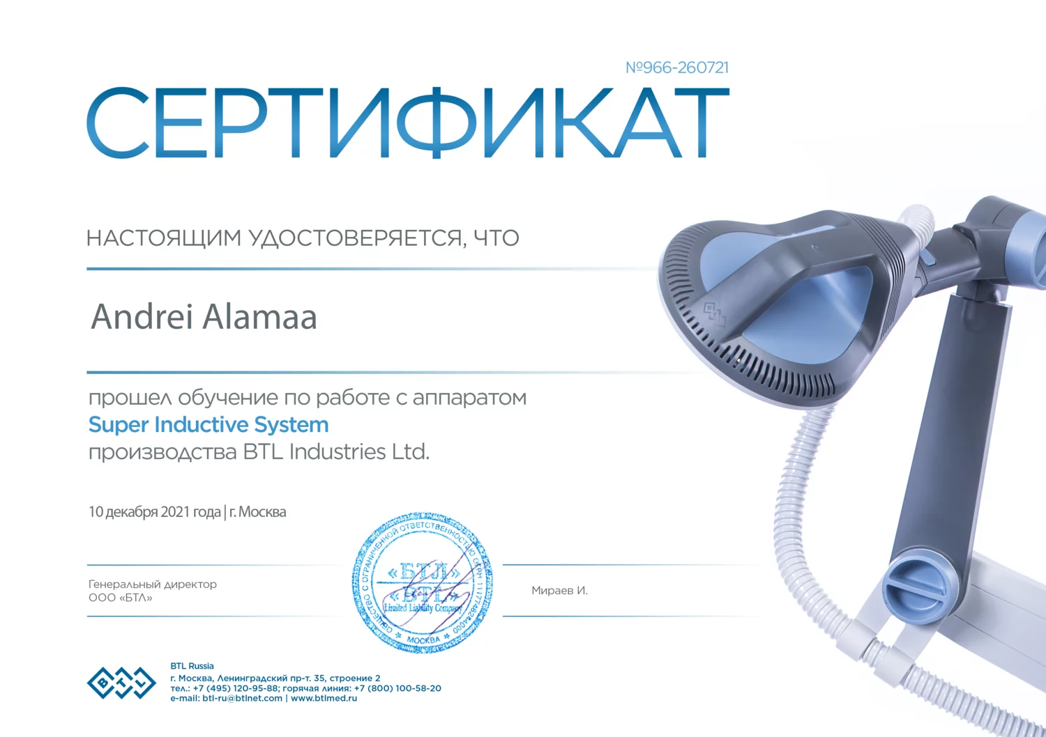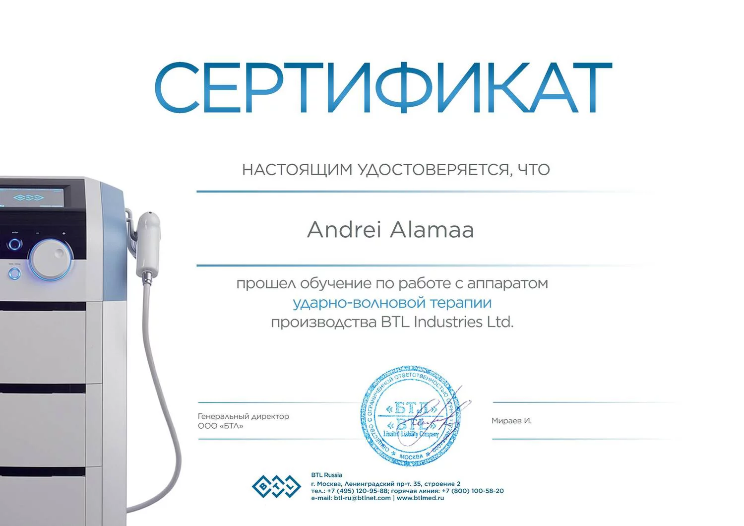 Использую физиотерапевтическое оборудование высококлассных медицинских компаний, таких как Gymna (Бельгия), BTL (Великобритания), Chinesport (Италия) и Globus (Италия). Эти аппараты помогают достигать максимального эффекта в процессе лечения.